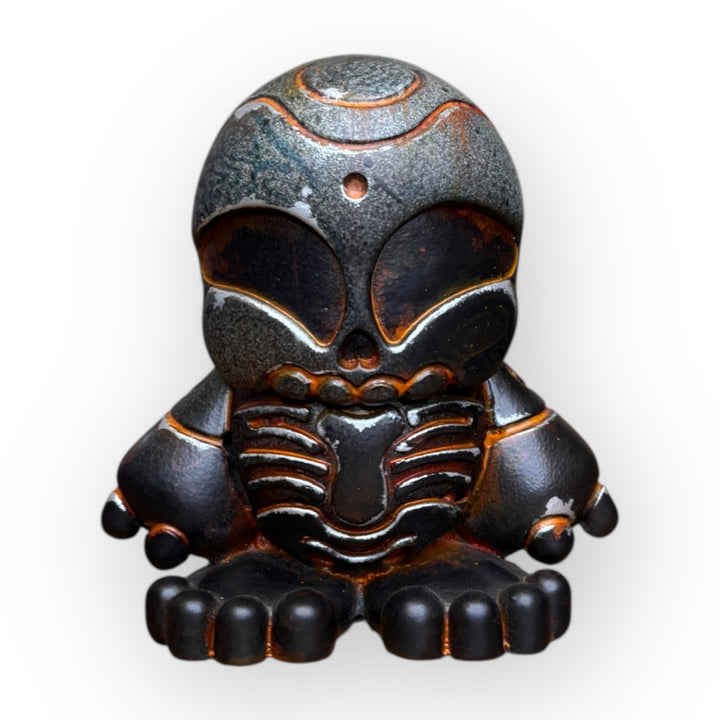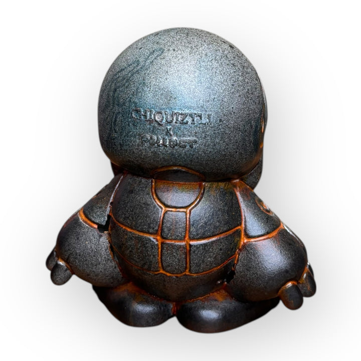 This piece , Chiquiztli Custom – Rust by Alonso Saints, explores the aesthetics of wear, time, and transformation. Through a dark palette with rust-like finishes and aged metal , the artist transforms the figure into an object that appears to have been salvaged from an industrial relic, imbued with character and visual depth.