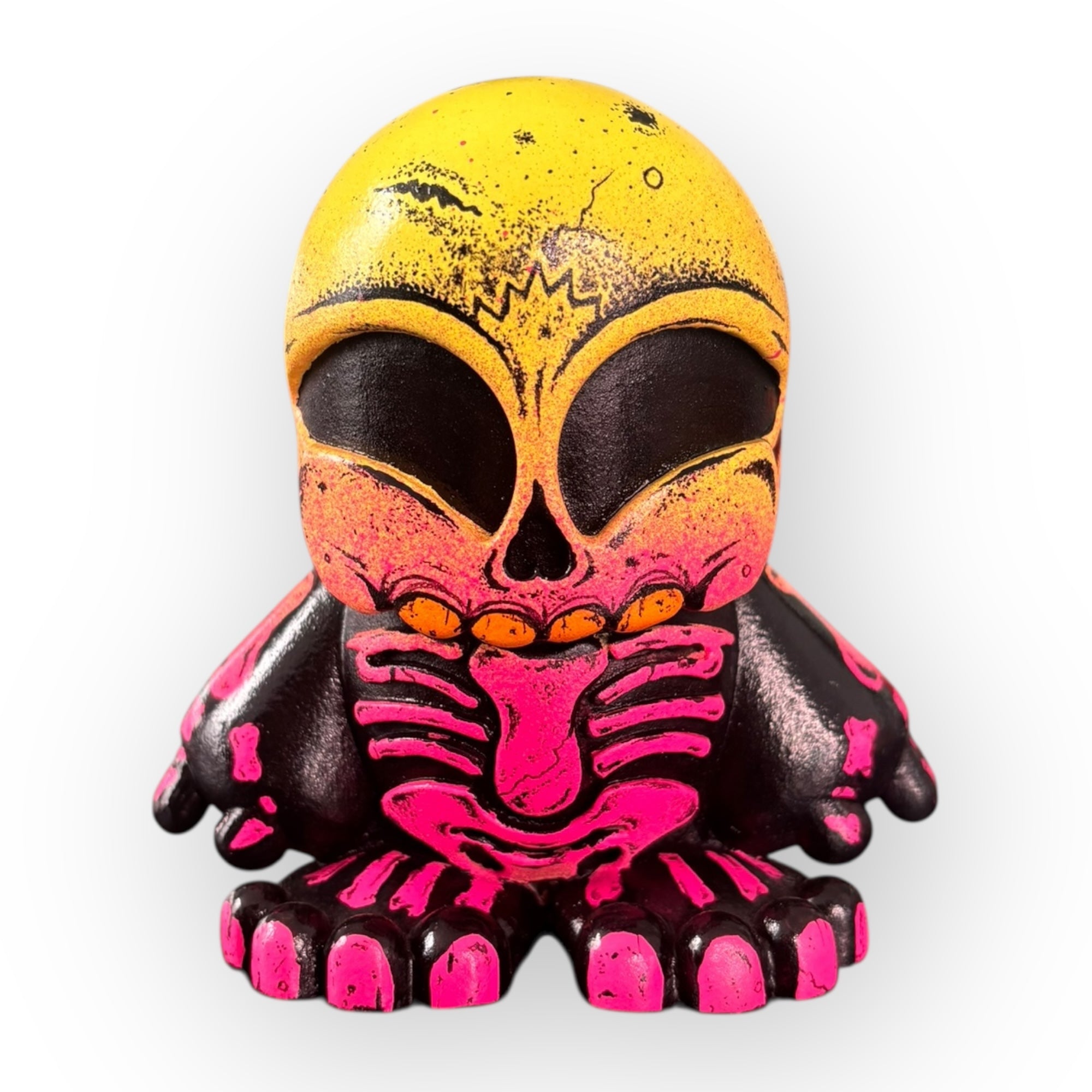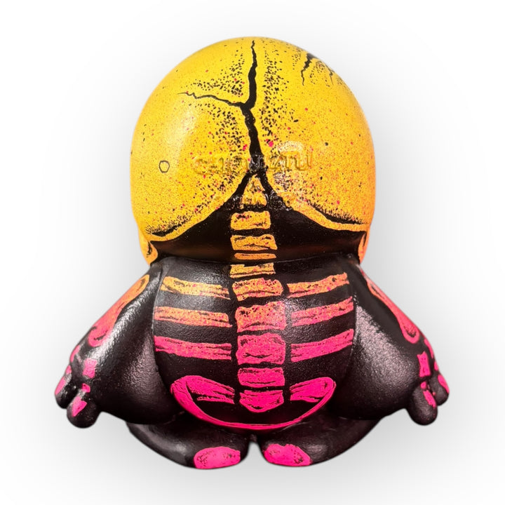 This 10cm Chiquiztli Custom is a one-of-a-kind piece created by Mr. Humo , an artist renowned for his raw, dark aesthetic deeply rooted in street art. In this version, Humo transforms the figure into an intense and visceral totem, combining aggressive gradients in neon yellow and pink with deep blacks and textures that evoke smoke, fire, and urban decay.