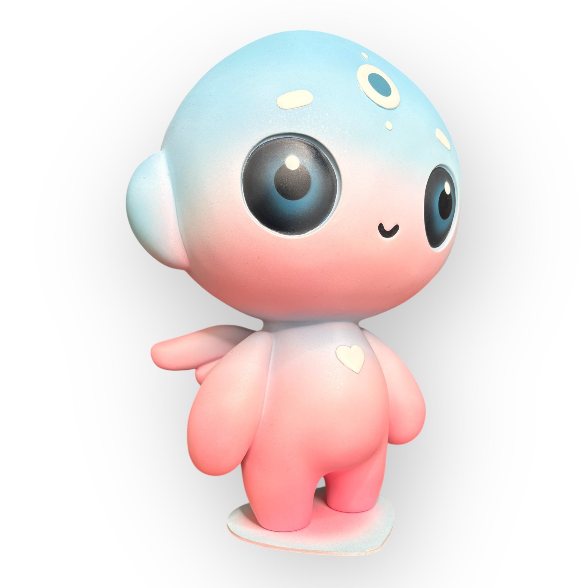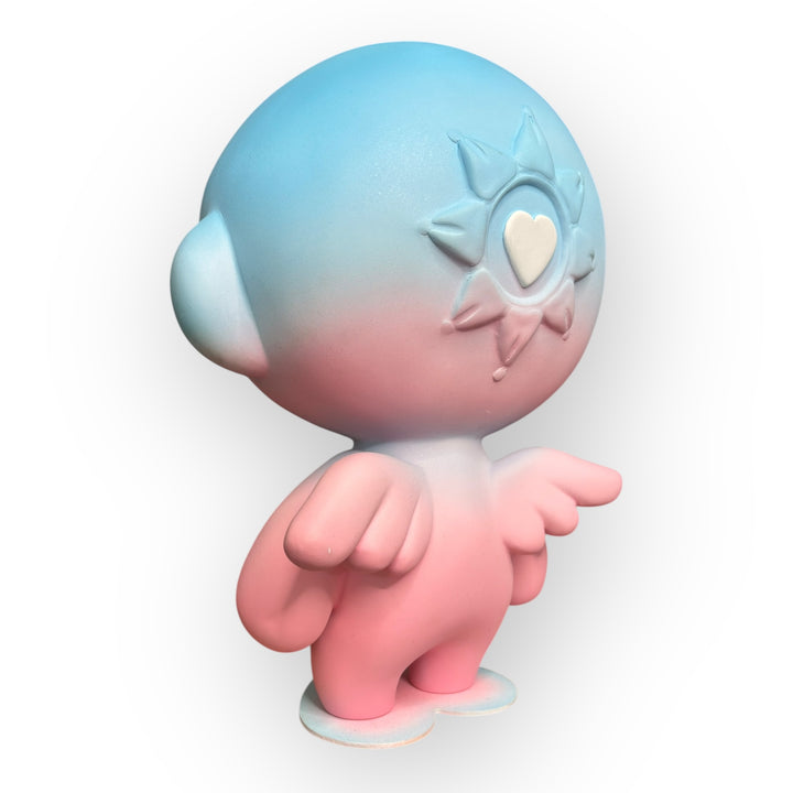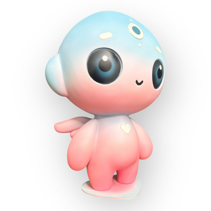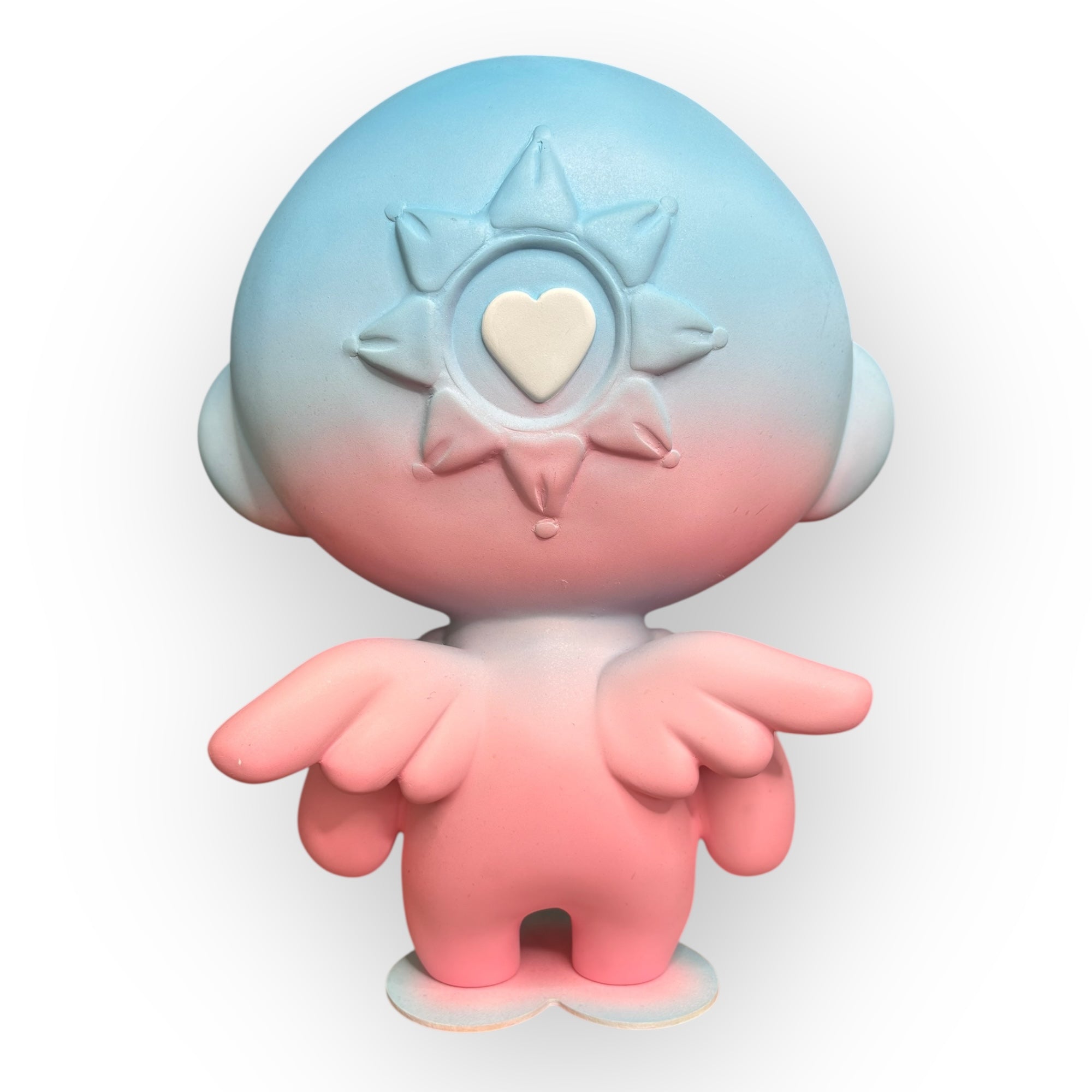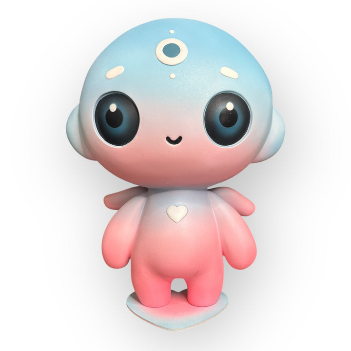 The soft gradient in shades of blue and pink symbolizes the emotional transition between calm and vulnerability, reason and emotion, while the white details—the heart, the solar symbols, and the third eye—serve as visual anchors of hope, sensitivity, and awareness. Harmony doesn't seek to hide fragility: it embraces it, transforms it, and makes it its identity. Its serene expression and rounded proportions evoke protection, tenderness, and a direct connection to the inner child.