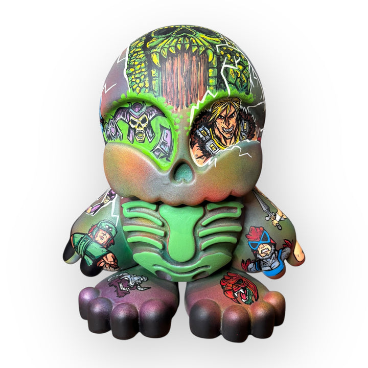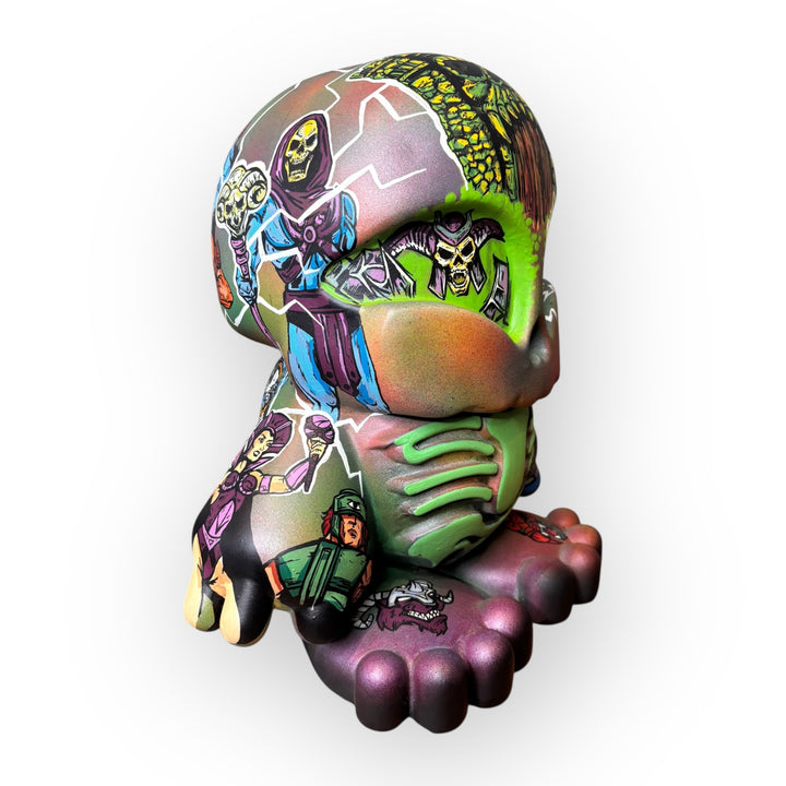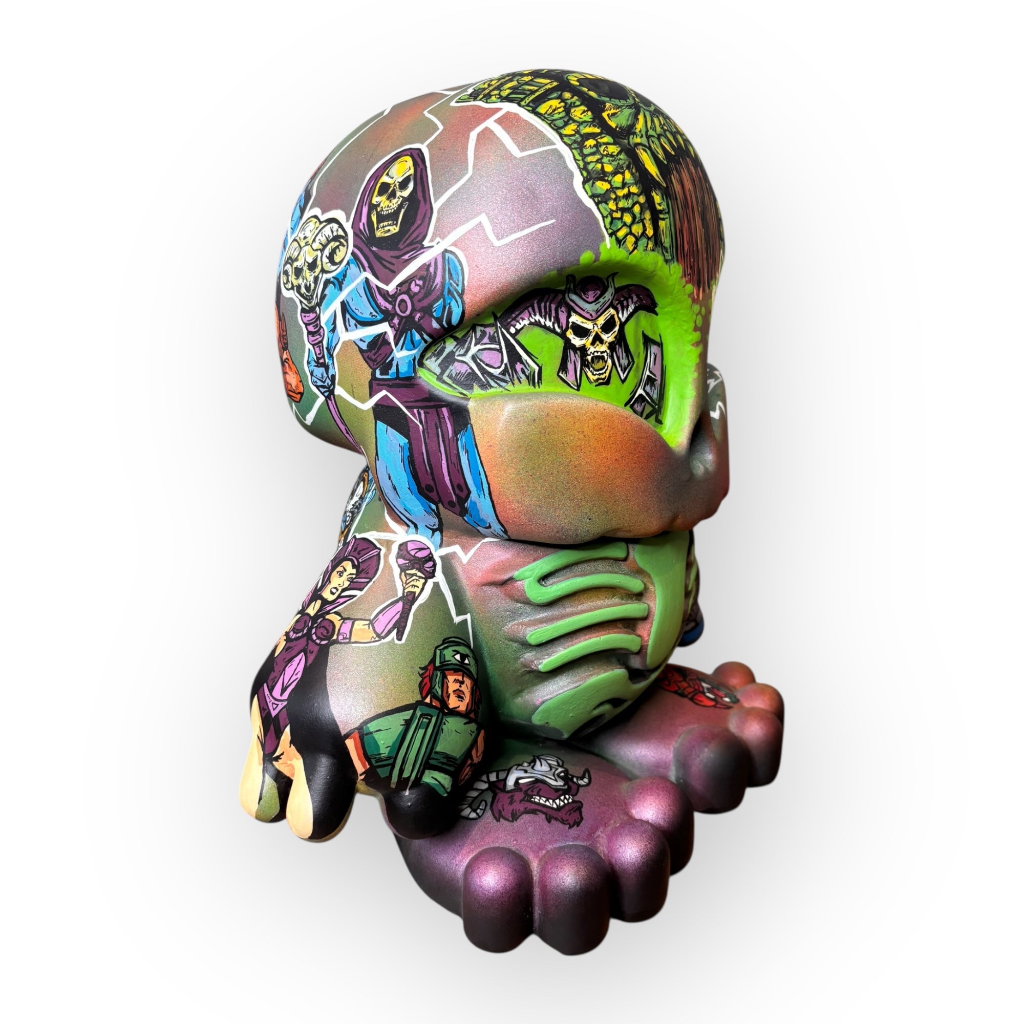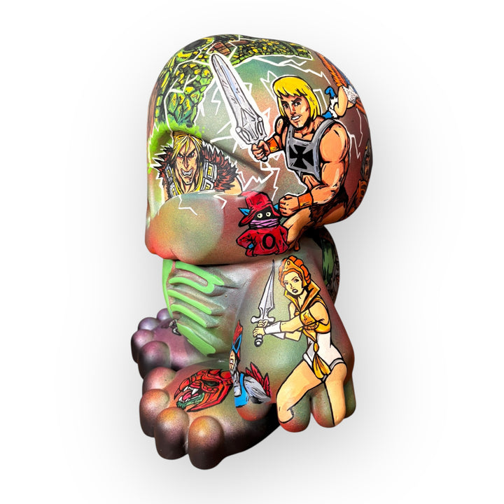 どの角度から見ても、マスターズ・オブ・ザ・ユニバースにインスパイアされた象徴的なキャラクターやシーンが、アートトイのボリュームに有機的に溶け込んでいます。手描きのディテールは、メタリックなグラデーション、強烈なコントラスト、そして現代の壁画を彷彿とさせる明確なストロークを組み合わせ、鮮やかで表現力豊かな作品に仕上がっています。