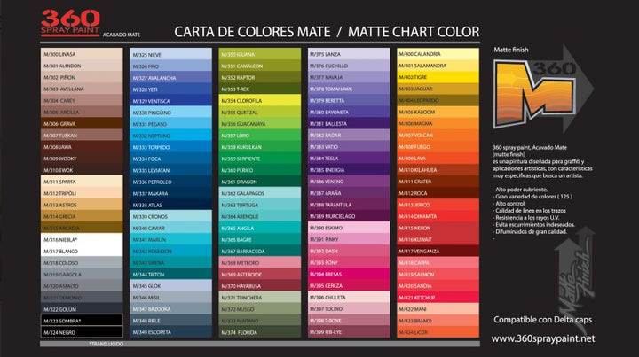 La pintura en aerosol 360 Mate ofrece un acabado completamente opaco, uniforme y sin reflejos, ideal para trabajos donde el color y la textura son protagonistas. Su alta pigmentación garantiza cobertura sólida desde la primera capa, permitiendo trazos definidos, degradados limpios y rellenos intensos.