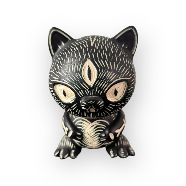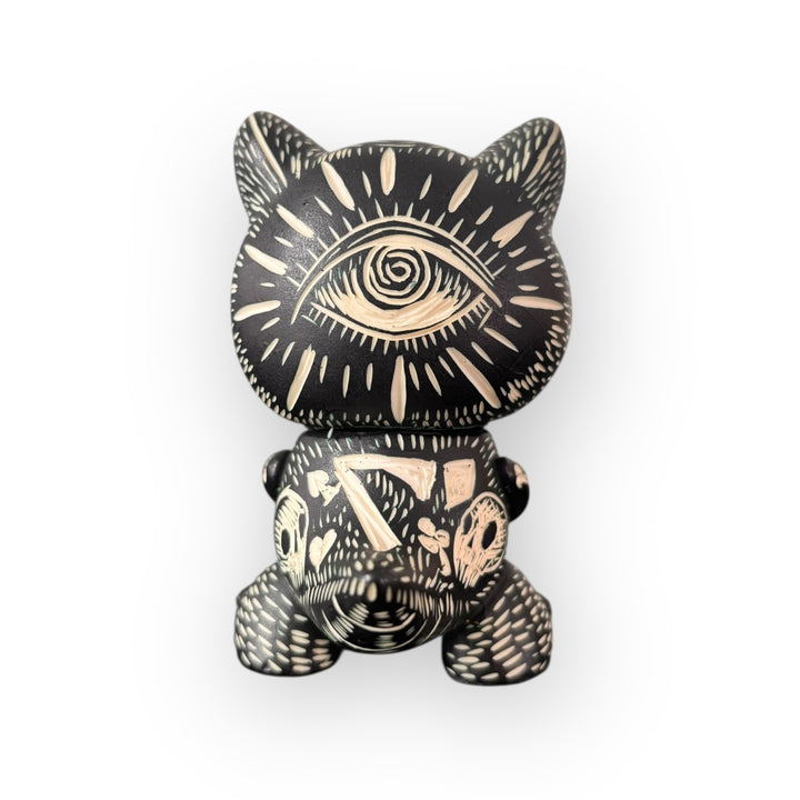 Black Cat es una pieza intervenida por Beto Magneto, artista que destaca por trasladar técnicas gráficas tradicionales al formato del art toy. En esta obra, el vinil funciona como soporte para una linografía realizada completamente a mano, donde cada trazo tallado aporta profundidad, textura y una identidad visual única.