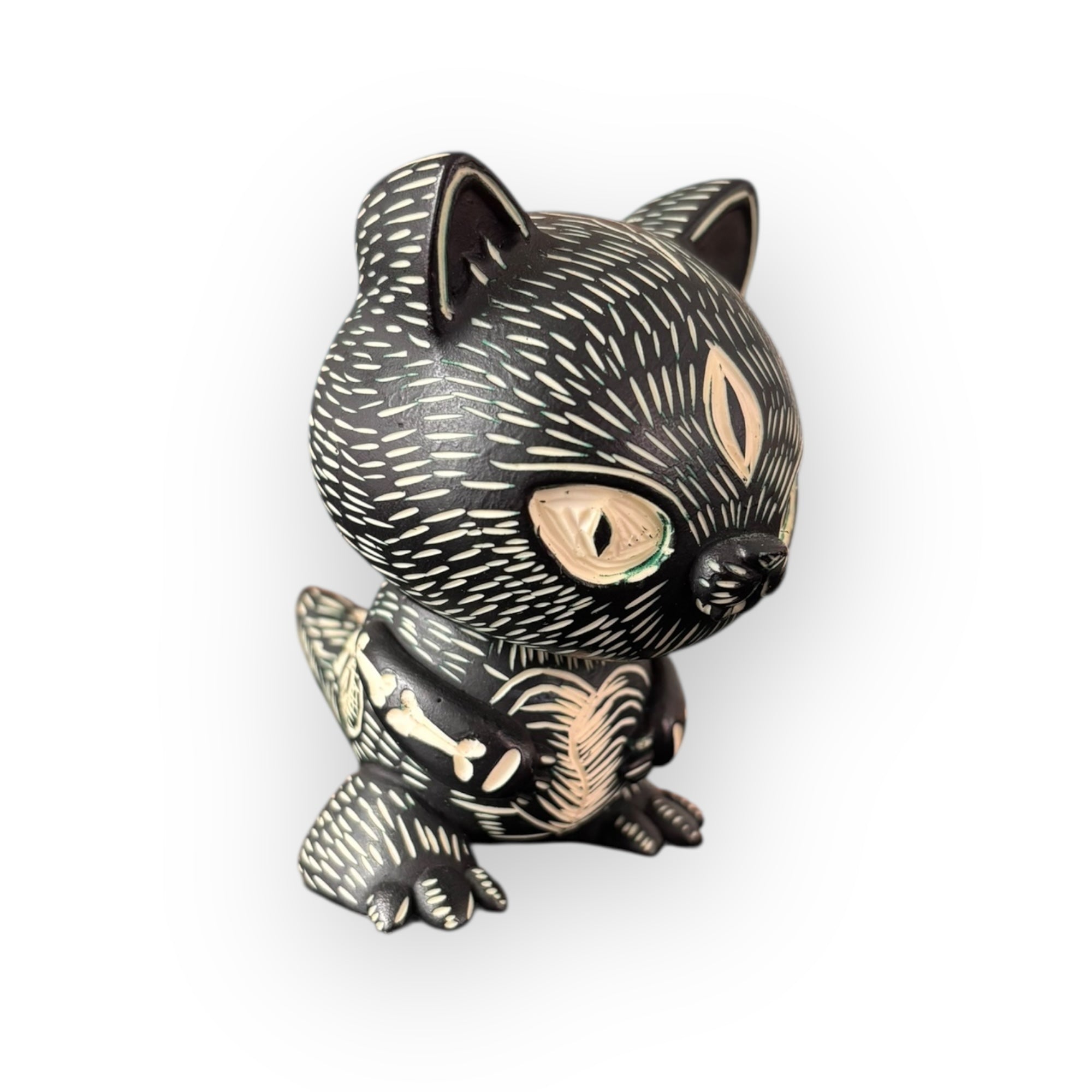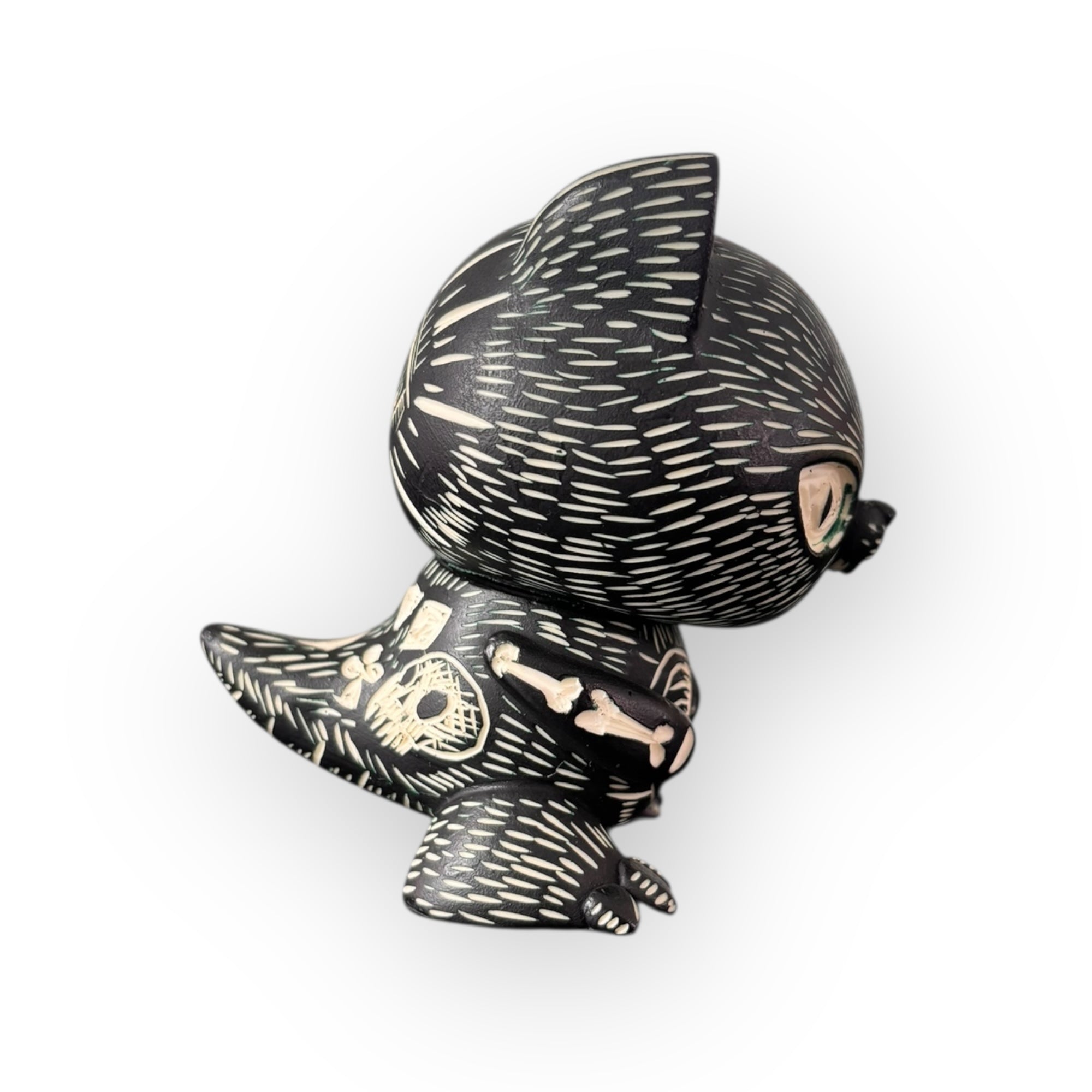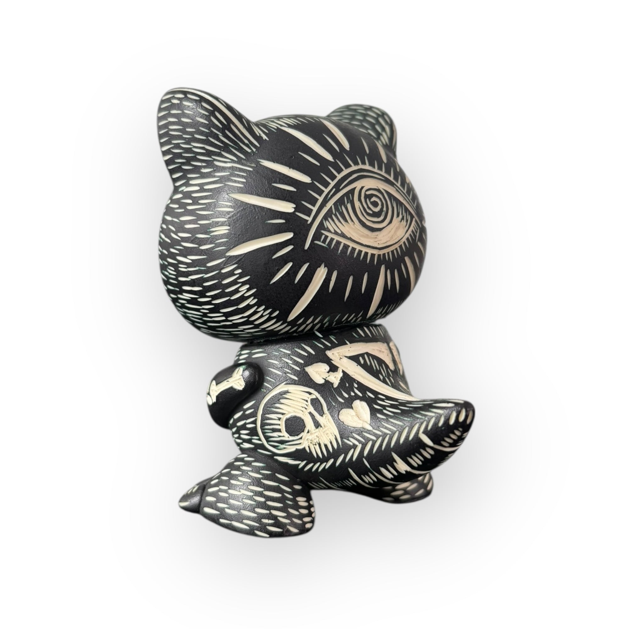 La estética monocromática potencia el carácter gráfico de la pieza, integrando símbolos recurrentes como ojos, cráneos, corazones y patrones orgánicos que dialogan entre lo ritual, lo intuitivo y lo contemporáneo. El resultado es una figura con fuerte presencia visual, donde el proceso artesanal es tan importante como el resultado final.