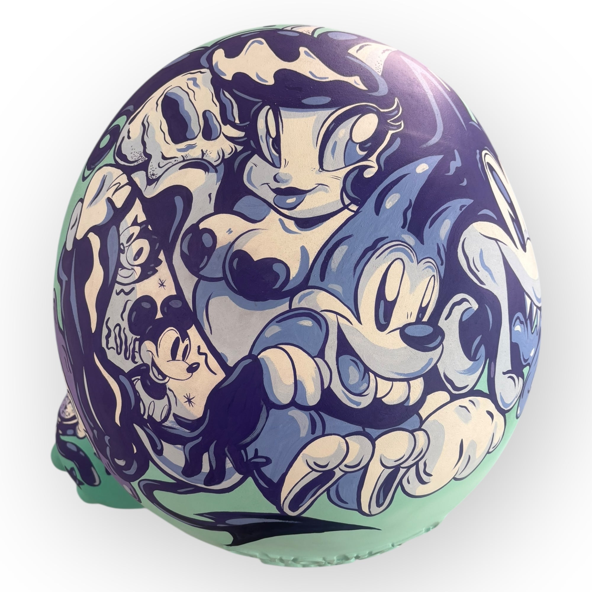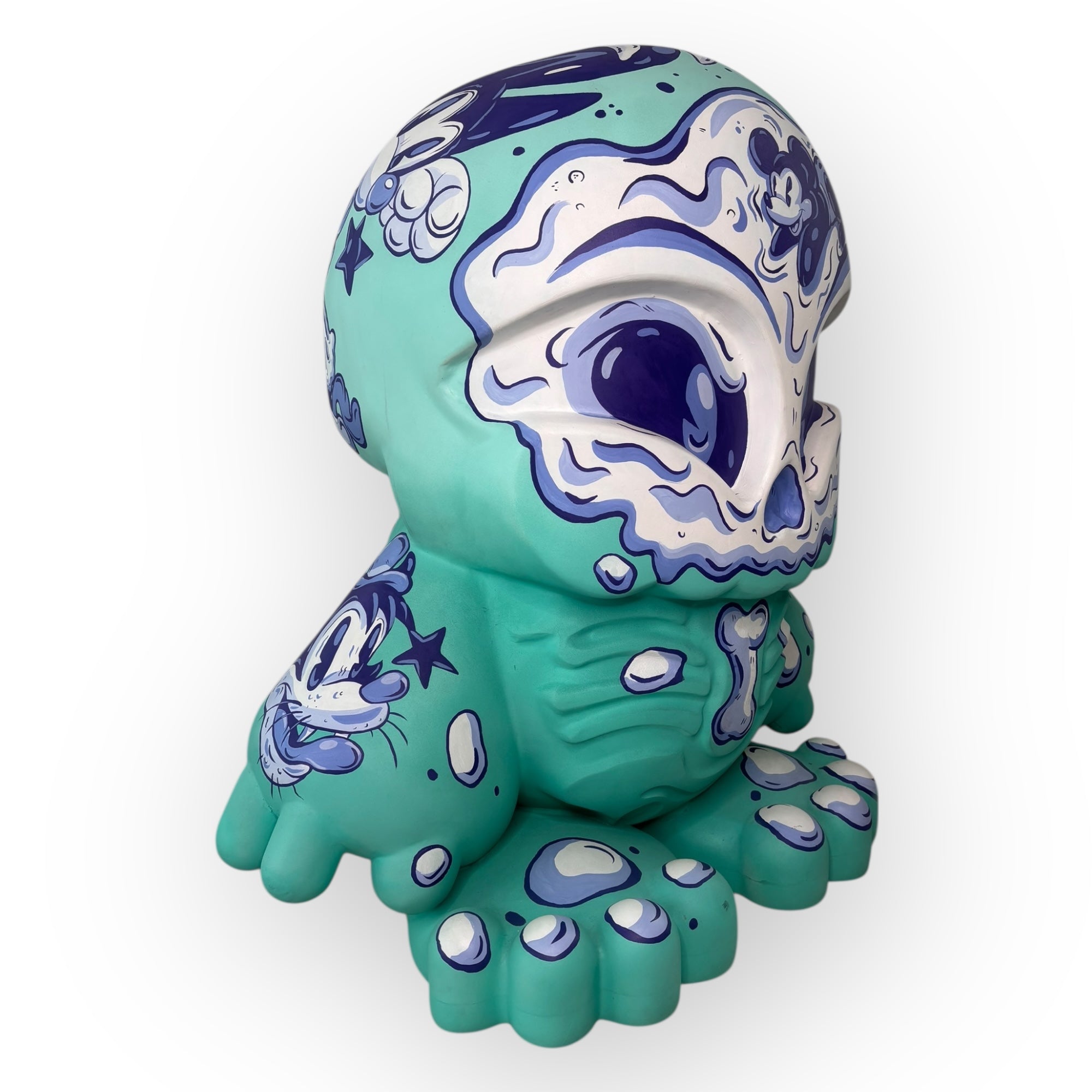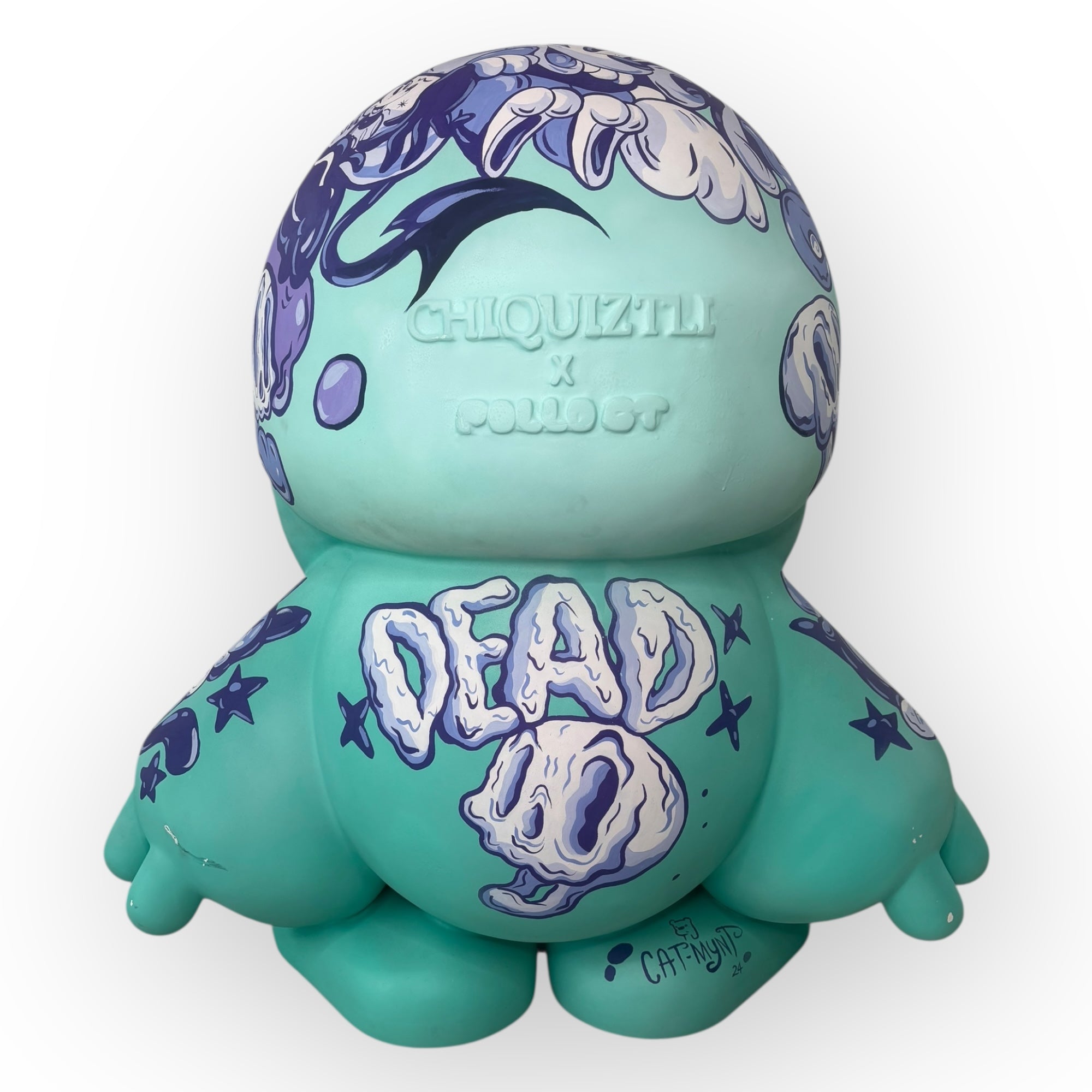 Mint Doodles es una intervención de gran formato donde Catmynt traslada su lenguaje ilustrado —caracterizado por personajes únicos, paletas suaves y líneas expresivas— a una pieza escultórica de un metro de altura. El resultado es un art toy que funciona como un lienzo tridimensional continuo, pensado para ser recorrido visualmente desde cualquier ángulo.