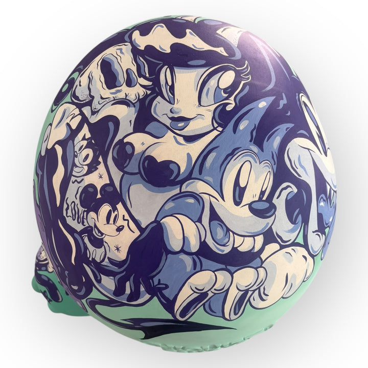 Sobre una base menta, el artista construye una narrativa envolvente a través de doodles pintados 100% a mano, integrando personajes, símbolos y gestos gráficos que dialogan entre lo lúdico y lo nostálgico. Cada trazo conserva la espontaneidad del dibujo directo, reforzando la sensación de movimiento y vida dentro de la pieza.