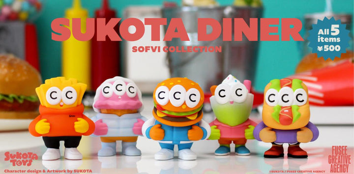 Sukota Diner – Sofvi Collection (Gachapon) es una mini figura coleccionable tipo sofubi (soft vinyl) con estética diner retro creada por SUKOTA y fabricada por FUSEE, lanzada como cápsula gachapon en Japón; la serie incluye 5 modelos y se entrega random (sorpresa), tal como si la sacaras de una máquina, perfecta para vitrina, escritorio o para fans de art toys kawaii con diseño súper cuidado y colores/forma con vibe “americana” de diner.