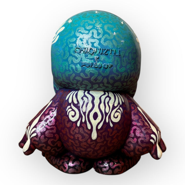 Esta pieza única de Trece Anfibio reinterpreta a Chiquiztli a través de un lenguaje floral, simbólico y profundamente artesanal. La superficie está cubierta por patrones orgánicos inspirados en flores, raíces y trazos rituales, pintados completamente a mano, capa por capa, sin procesos industriales.