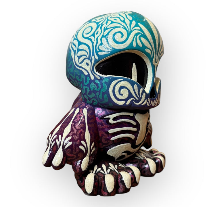 El acabado UV Reactive revela una segunda lectura de la pieza bajo luz ultravioleta, activando detalles ocultos que transforman el color, la profundidad y la presencia del art toy. Esta dualidad —visible y latente— es parte central del discurso de Trece Anfibio: lo natural, lo simbólico y lo invisible conviviendo en un mismo objeto.